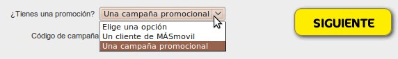 Antes de elegir la modalidad de contrato o prepago, si tenemos un código promocional o cupón es el momento de introducirlo. Tenemos la ventaja de que si el cupón promocional no es válido, nos lo rechazará, por lo que al final del pedido no tendremos la duda de si lo introdujimos mal. Podemos también introducir el número de un amigo que tenga MÁSmovil y él y tú os llevaréis 5 euros de saldo, pero si introducimos un codigo promocional no podemos meter el numero de un amigo y al contrario.