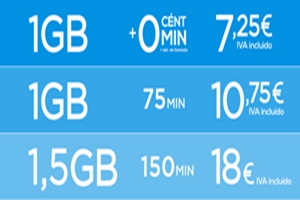 Segunda tarifa: 1GB de datos a 0 céntimos el megabyte + 75 minutos de llamadas a 0 céntimos el minuto y con un establecimiento de llamada de 0 céntimos + SMS solamente nacionales a 9.68 céntimos. Todo a 10.75€ (con IVA incluido)