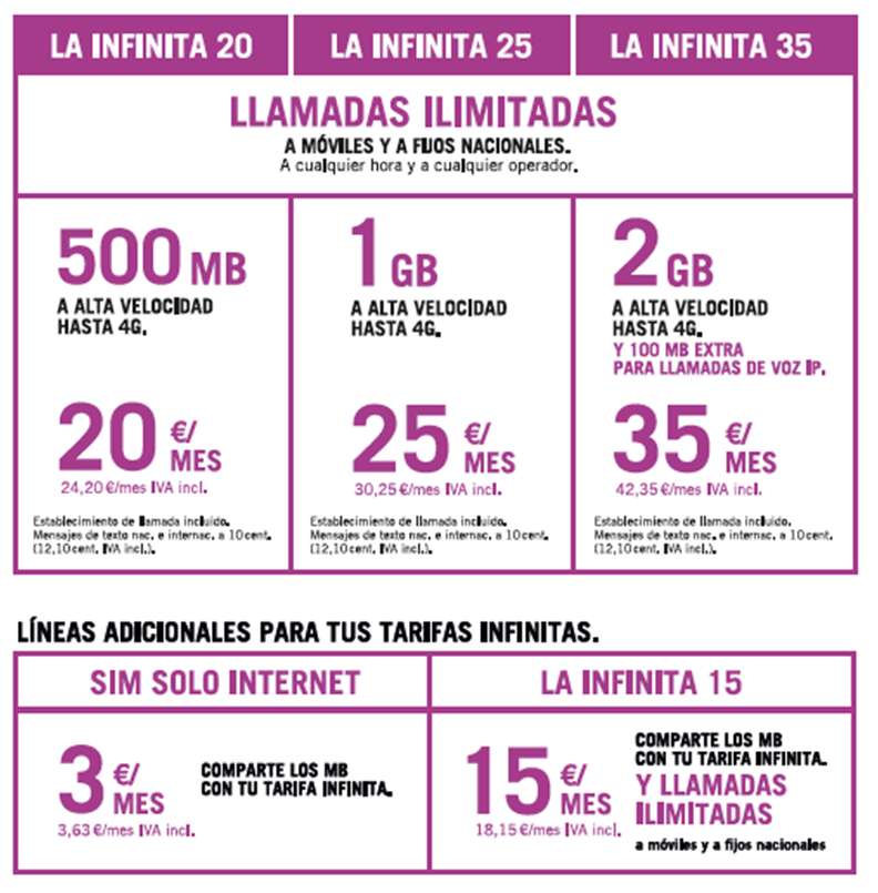 Esos datos los usaremos en la primera línea (incluída), pero también en el resto de líneas que contratemos, donde podremos contratar una línea de 3 euros al mes llamada SIM solo internet, y la Infinita 15, que permite realizar las llamadas ilimitadas que queramos.
