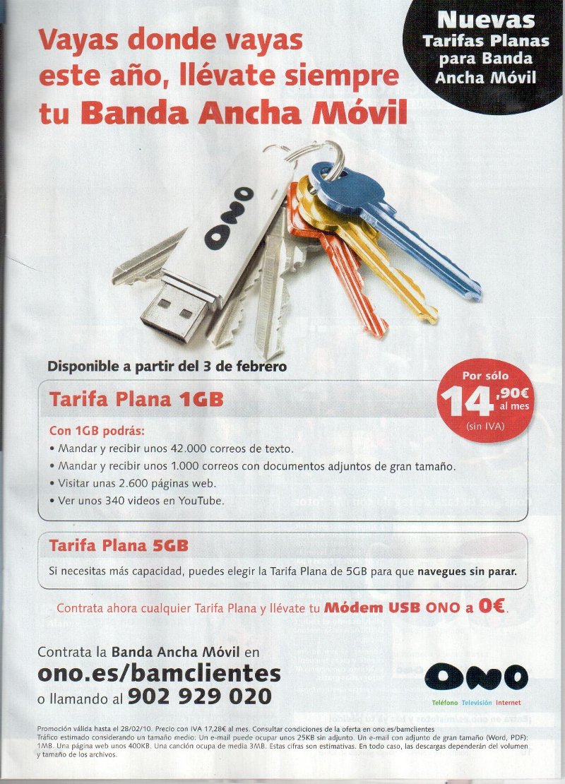 ONO ha remodelado sus tarifas de Internet Móvil y fruto de esta tenemos la oferta de 1 GB de Internet móvil por 14.95 euros al mes, eso sí firmando 18 meses de permanencia.